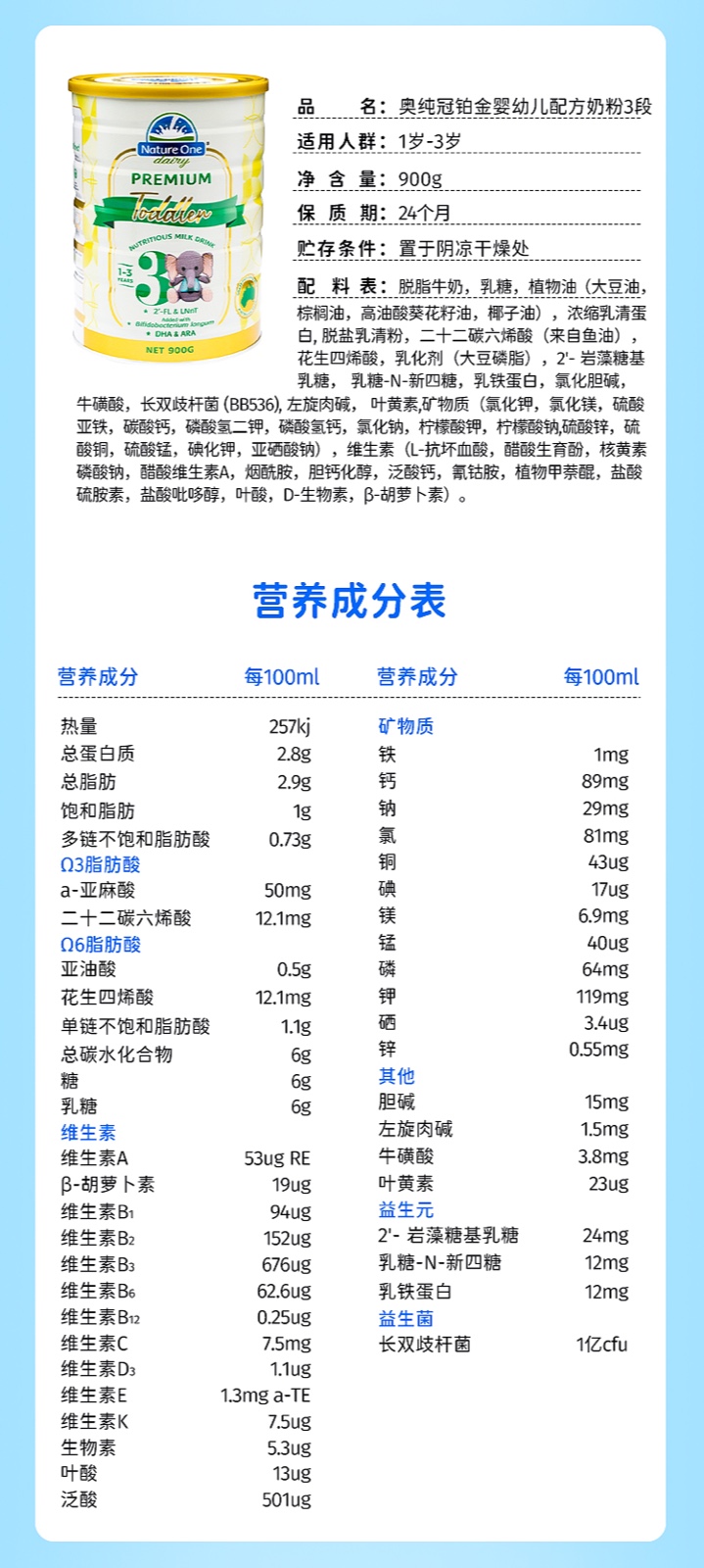 奥纯冠 (Nature One Dairy)全护铂金版婴儿奶粉 3段 900g/罐