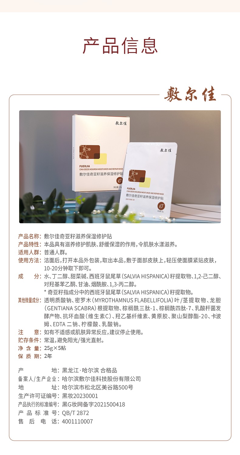 敷尔佳 奇亚籽滋养保湿修护贴奇亚籽面膜/珍萃贴(5贴/盒)