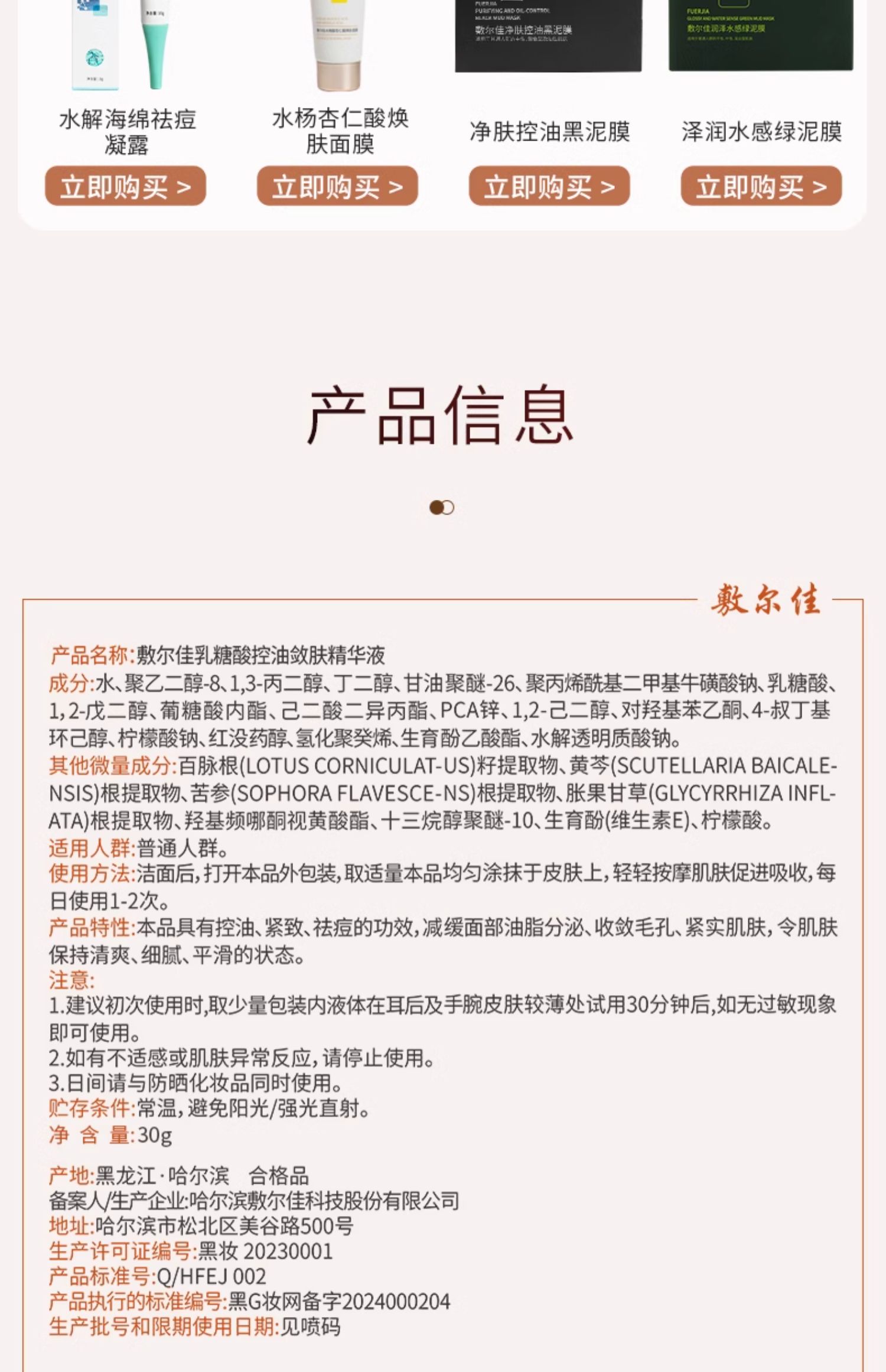 敷尔佳 乳糖酸控油敛肤精华液乳糖酸精华(30ml)