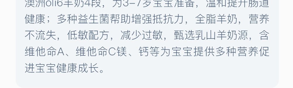 6 )您购买的境外商品适用的品质、健康、标识等项目使用标准均按照按照国际标准生产(比如本平台所售婴幼儿配方奶粉蛋白质含量可能低于国内标准,长期喂食会造成婴幼儿蛋白质摄入不足,建议及时补充肉类或鱼类辅食),所以在使用过程中产生的危害或损失以及其他风险,将由您个人承担。